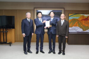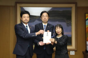 11月25日、「熊本県生活協同組合連合会」及び「生活協同組合くまもと」から、令和7年8月の大雨により被災された方々への支援のため、義援金の寄贈の贈呈式が執り行われました。熊本県生活協同組合連合会からは、嶋田会長理事、上村副会長理事、髙見専務理事が出席、生協くまもとからは嶋田理事長、中野常任理事が出席されました。目録は、嶋田理事長から木村知事へ渡されました。嶋田理事長は「生活協同組合は相互扶助の組織。このような時こそ生協の助け合いの精神を発揮したい」と述べられていました。