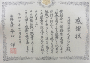 生協くまもとは、法務省主唱による「社会を明るくする運動」~犯罪や非行を防止し、立ち直りを支える地域のチカラ~ の活動に協力し推進に貢献したとして、法務大臣感謝状を受彰しました。