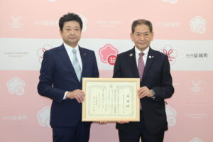 3月25日、益城町における「企業版ふるさと納税」への寄附に対し、感謝状贈呈式が行われ、嶋田理事長が出席し、西村町長より感謝状を賜りました。