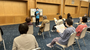 最初に「運動は薬」と言われるように、歩くことの大切さや1日の歩数も意識してほしいということを学び、実践に移りました。まず自分の体と向き合いながら、椅子に座ったままできる準備運動を行いました。
